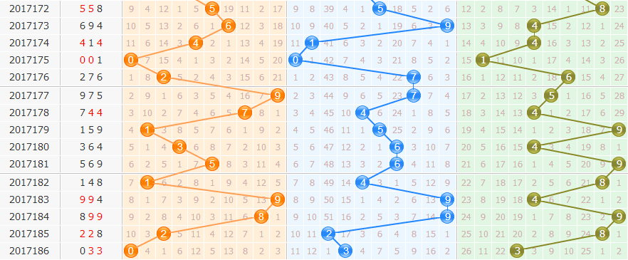和值分析:上期和值06点,和值走势下降,近期和值走势波动较大,本期重点和值关注16防12点。