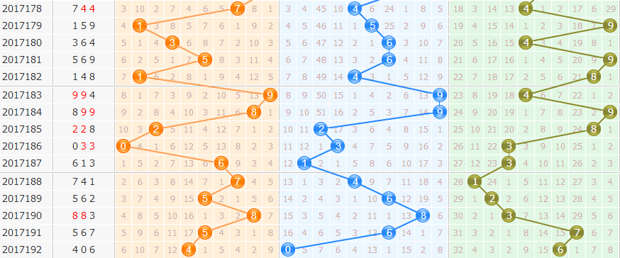 和值分析:上期和值10点,和值走势下降,近期和值走势波动较大,本期重点和值关注16防20点。