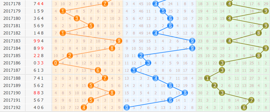 本期号码上数十期开奖号码为994,百位9,对应数4、补数1;十位9,对应数4、补数1;个位4,对应数9、补数6。