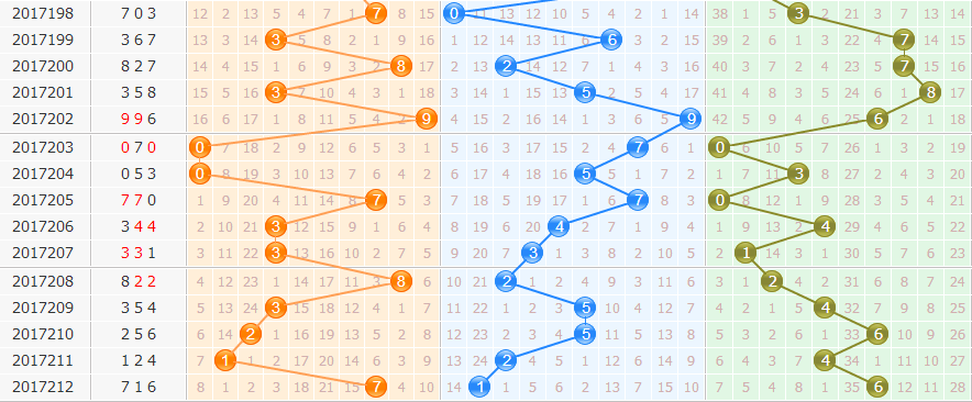 个位:近期个位上的跨度走势(6-3-3-4-3-1-2-2-2-2),根据跨度公式推算,本期留意跨幅大跨隔期开出,防小跨连续开出,重点推荐小跨1、3防大跨6。推荐号码0、3、5