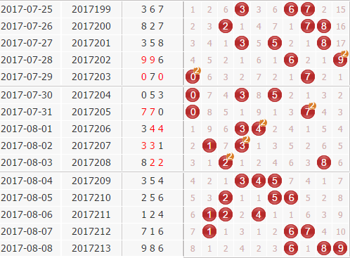 组三号码分析:组三号码近期出现中小号对子较多,后期主防大号对子8、9等。