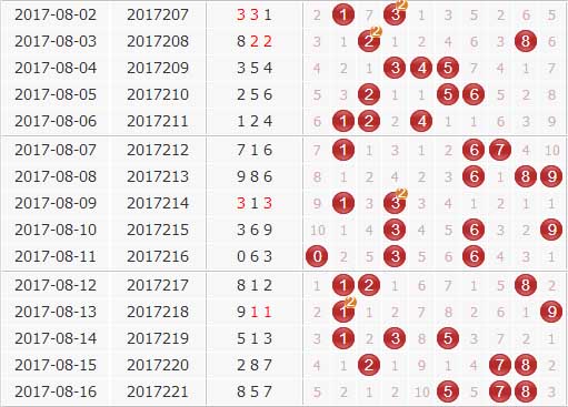 组选分析:在组选分布图上,小号0-2上期断开,本期关注开出1-2枚;中部号码3-6上期开出1枚,本期关注开出1-2枚;大号7-9上期开出2枚,本期防开出0-1枚;结合组选复隔中分布图,上期开出组选复复隔形态,本期关注中码最少开出1-2枚。本期出号条件:复隔码2578=1-2枚,中码013469=1-2枚。
