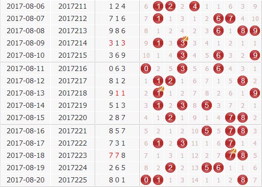 和值分析:上期开出和值9,下期看好中间和值,重点关注10 12 15 17。