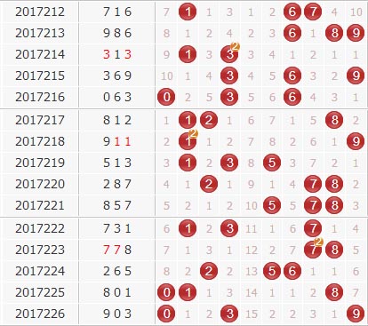 组选分析:在组选分布图上,小号0-2上期开出1枚,本期关注开出0-1枚;中部号码3-6上期开出1枚,本期关注开出1-2枚;大号7-9上期开出1枚,本期防开出1-2枚;结合组选复隔中分布图,上期开出组选复中中形态,本期关注复隔码最少开出1-2枚。本期出号条件:复隔码01389=1-2枚,中码24567=1-2枚。