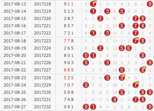 跨度振幅:近10期跨度振幅为5-3-4-1-6-1-5-3-0-5,本期重点关注跨度振幅0-5。