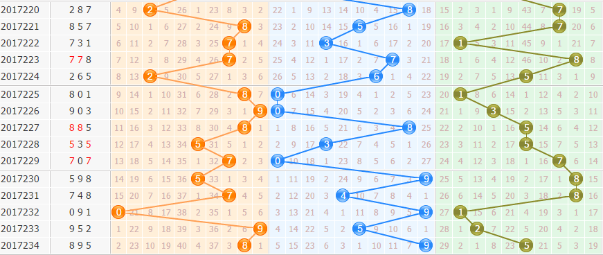 和值分析:上期和值22点,和值走势上升,近期和值走势波动较大,本期重点和值关注15防10点。