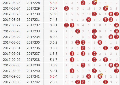 胆码分析:上期开奖号237,下期关注数字5,防数字0 8。