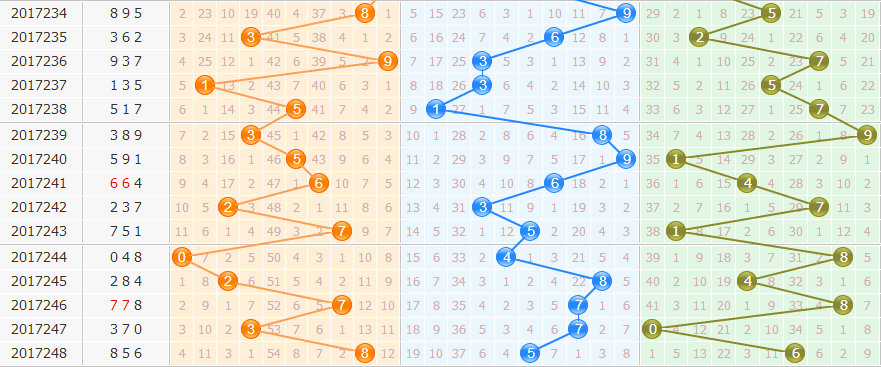 跨度分析:上期跨度3,属于小跨度开出,分析近期各区出号走势,本期跨度值看好大跨度值,重点关注5跨防3跨。