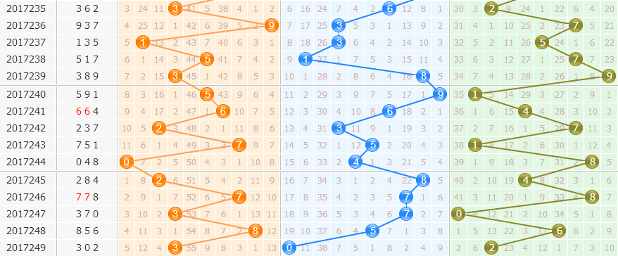 17250期胆码推荐:237 开出1-2个,金胆:2 银胆:3
