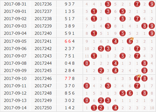 胆码分析:上期开奖号142,下期关注数字7,防数字1 5。