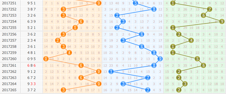 和值分析:上期和值12点,和值走势下降,近期和值走势波动较大,本期重点和值关注17防15点。