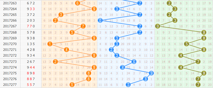 和值分析:上期和值17点,和值走势下降,近期和值走势波动较大,本期重点和值关注07防09点。