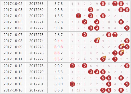 组选分析:在组选分布图上,小号0-2上期断开,本期关注0-1枚;中部号码3-6上期开出2枚,本期看好开出1-2枚;大号7-9上期开出1枚,本期防开出1-2枚;结合组选复隔中分布图,上期开出组选复隔隔形态,本期关注中码最少开出1-2枚。本期出号条件:复隔码05689=1-2枚,中码12347=1-2枚。