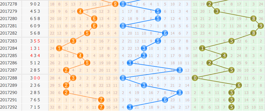 和值分析:上期和值13点,和值走势下降,近期和值走势波动较大,本期重点和值关注15防17点。
