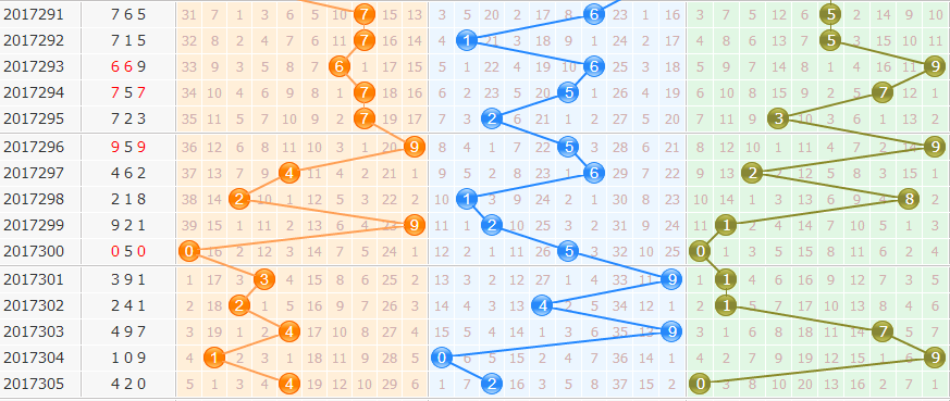 和值分析:上期和值6点,和值走势下降,近期和值走势波动较大,本期重点和值关注18防16点。