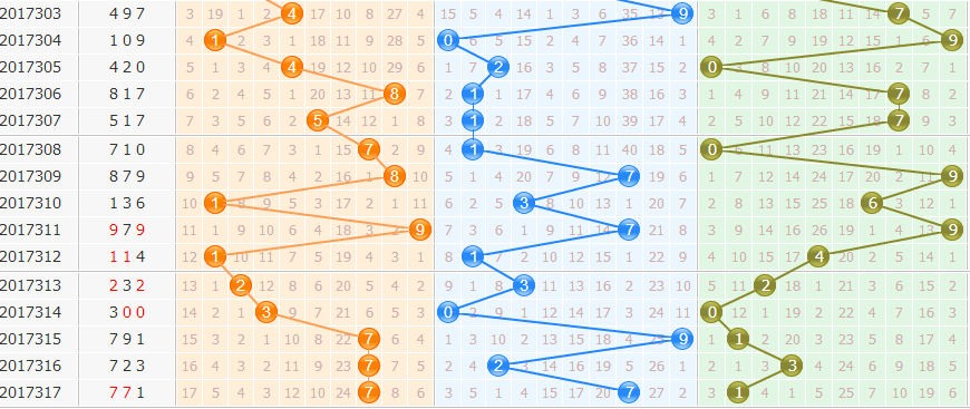 跨度分析:上期跨度6,属于大跨度开出,分析近期各区出号走势,本期跨度值看好小跨度值,重点关注4跨防7跨。