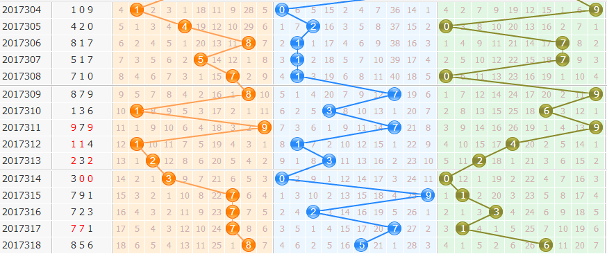 和值分析:上期和值19点,和值走势上升,近期和值走势波动较大,本期重点和值关注13防11点。