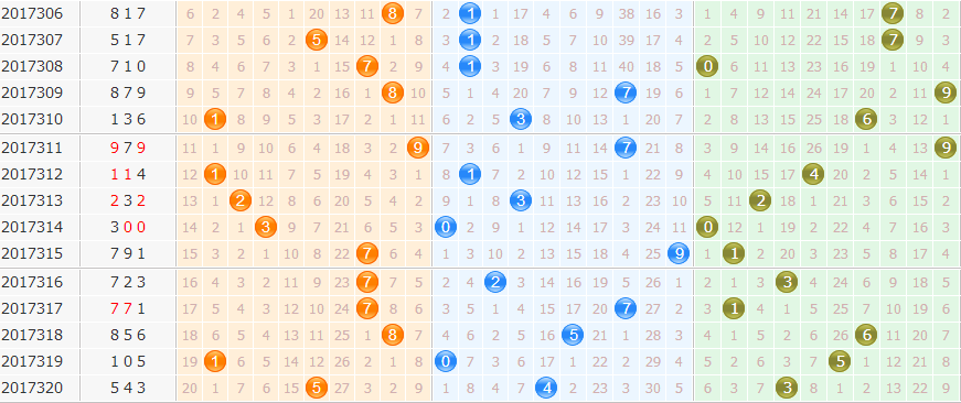 和值分析:上期和值12点,和值走势上升,近期和值走势波动较大,本期重点和值关注17防19点。