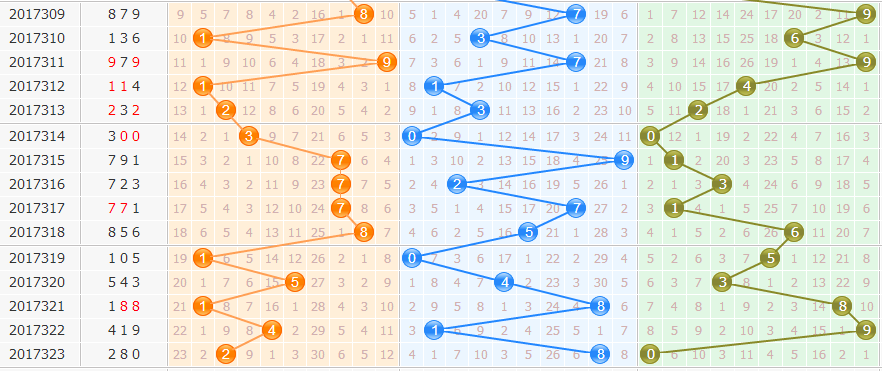 012路:2017323期012路的比值为1:0:2,综合多期的012路数据分析,17324期1路码有望强势回补。