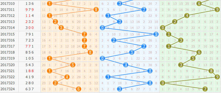 和值分析:上期和值16点,和值走势上升,近期和值走势波动较大,本期重点和值关注17防15点。