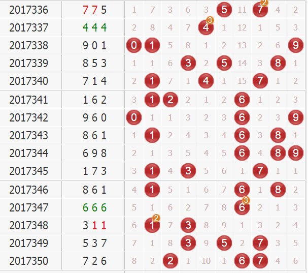 5、 和值:1、2路和值近期短缺,2路和尾近10期热开,本期关注和值10 13 14 16 17。