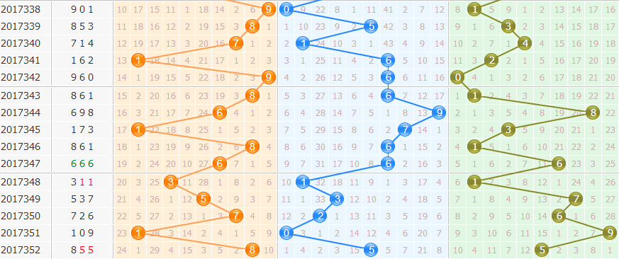 和值分析:上期和值18点,和值走势上升,近期和值走势波动较大,本期重点和值关注14防16点。