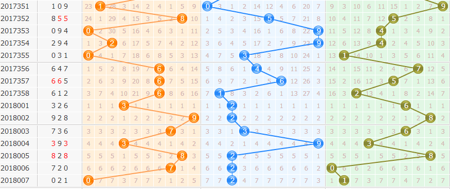 跨度分析:上期跨度2,属于小跨度开出,分析近期各区出号走势,本期跨度值看好大跨度值,重点关注6跨防5跨。