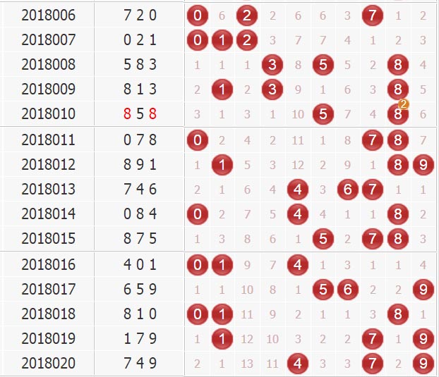 1、 组选分析:在组选分布图上,小号0-2上期断开,本期防0-1枚;中部号码3-6上期回补1枚,本期关注1-2枚;大号7-9上期开出2枚,本期防0-1枚;结合组选复隔中分布图,上期开出组选复复中形态,本期关注中码最少开出1-2枚。本期出号条件:复隔码1479=1-2枚,中码023568=1-2枚。