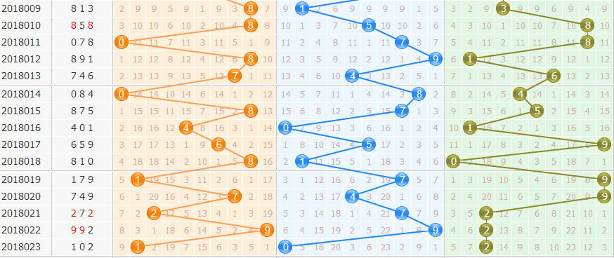 和值分析:上期和值3点,和值走势下降,近期和值走势波动较大,本期重点和值关注18防12点。
