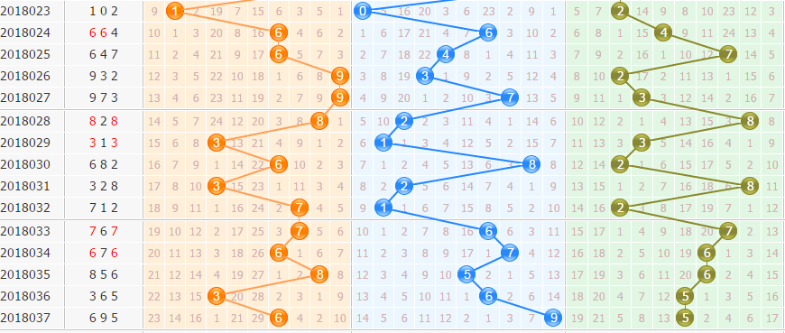 和值分析:上期和值20点,和值走势上升,近期和值走势波动较大,本期重点和值关注17防19点。