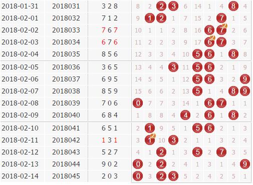 012路分析:最近两期0路码活跃度最高,具体是044期90、045期03,结合近期各路码的出球轨迹分析,第2018046期不看好0路码再落两枚。