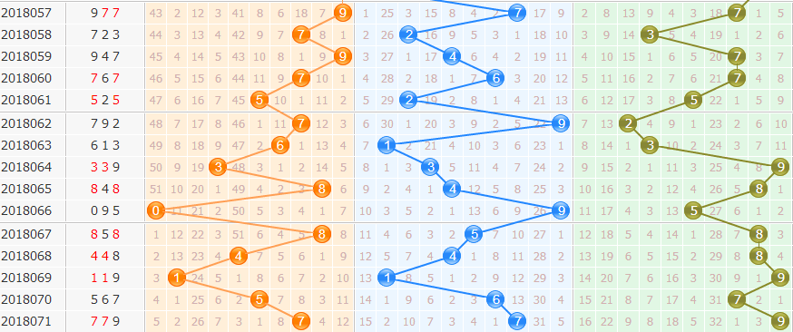 跨度分析:上期跨度2,属于小跨度开出,分析近期各区出号走势,本期跨度值看好大跨度值,重点关注5跨防8跨。