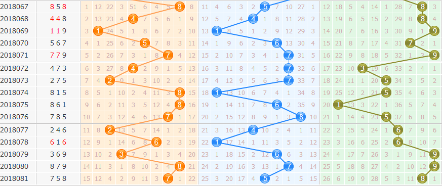 十位:近期十位上的跨度走势(0-0-6-5-2-4-3-5-1-2),根据跨度公式推算,本期留意跨幅大跨隔期开出,防小跨连续出号,推荐小跨2、3防大跨5。推荐号码0、3、8