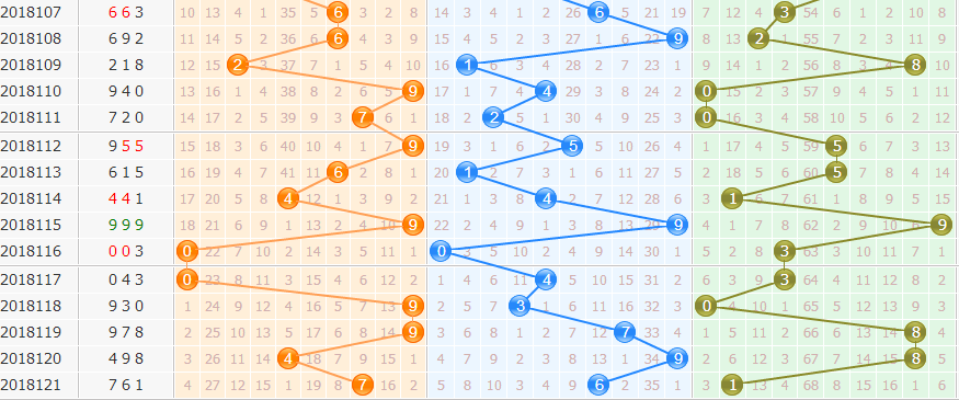 跨度分析:上期跨度6,属于大跨度开出,分析近期各区出号走势,本期跨度值看好小跨度值,重点关注4跨防5跨。