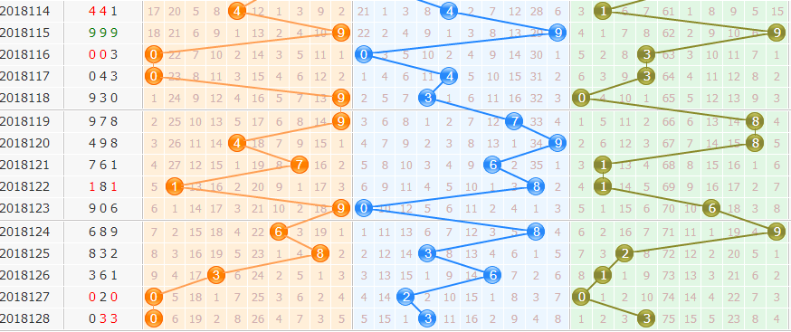 跨度分析:上期跨度3,属于小跨度开出,分析近期各区出号走势,本期跨度值看好大跨度值,重点关注7跨防3跨。