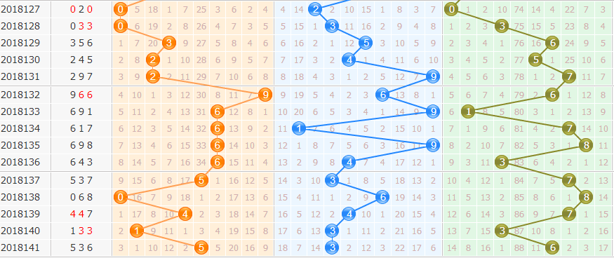 和值分析:上期和值14点,和值走势上升,近期和值走势波动较大,本期重点和值关注17防19点。