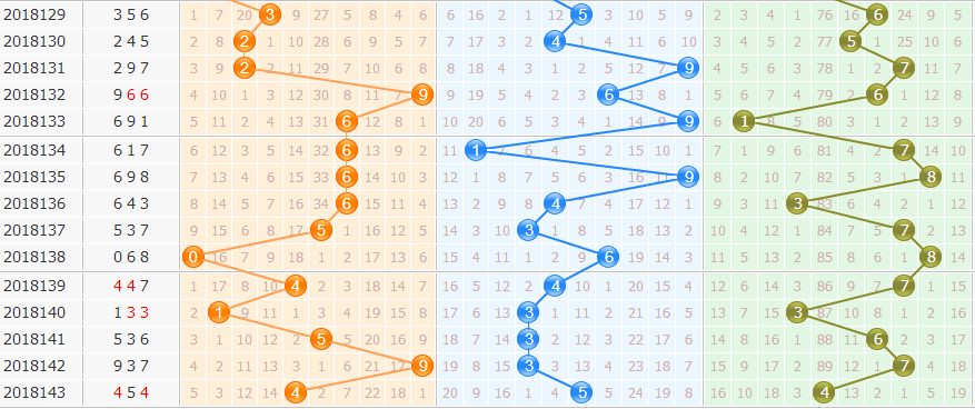 个位:近期个位上的跨度走势(6-1-5-4-1-1-4-3-1-3),根据跨度公式推算,本期留意跨幅大跨隔期开出,防小跨连续开出,重点推荐小跨1、4防大跨5。推荐号码3、8、9