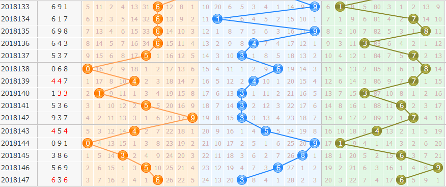 跨度分析:上期跨度3,属于小跨度开出,分析近期各区出号走势,本期跨度值看好大跨度值,重点关注6跨防4跨。