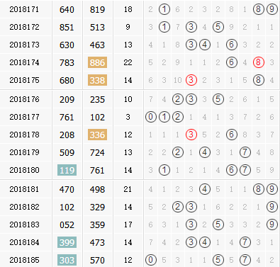 福彩3D第2018185期开奖号为:570,和值为12点,大小形态为大大小,奇偶形态为奇奇偶,跨度值为7。2018186期3d试机号前预测分析: