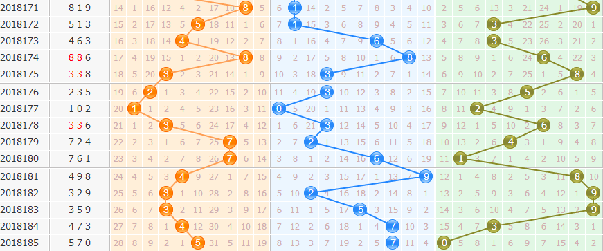 和值分析:上期和值12点,和值走势下降,近期和值走势波动较大,本期重点和值关注19防15点。