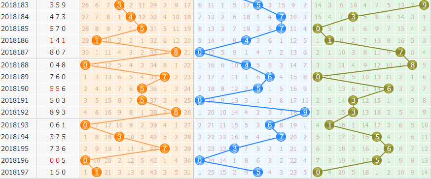 和值分析:上期和值6点,和值走势上升,近期和值走势波动较大,本期重点和值关注18防12点。