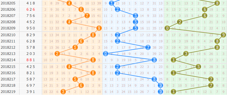 和值分析:上期和值13点,和值走势下降,近期和值走势波动较大,本期重点和值关注19防13点。