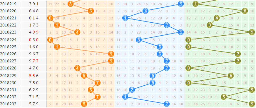 跨度分析:上期跨度4,属于小跨度开出,分析近期各区出号走势,本期跨度值看好小跨度值,重点关注4跨防7跨。