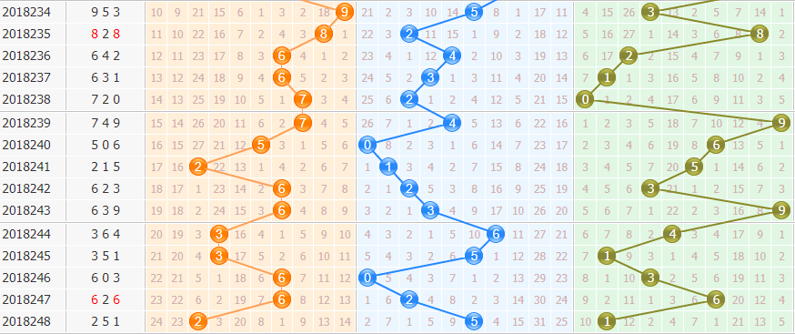 和值分析:上期和值8点,和值走势下降,近期和值走势波动较大,本期重点和值关注14防8点。