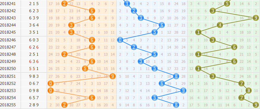 跨度分析:上期跨度7,属于大跨度开出,分析近期各区出号走势,本期跨度值看好小跨度值,重点关注3跨防8跨。