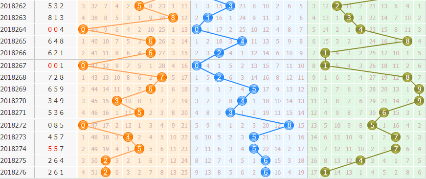 跨度分析:上期跨度5,属于大跨度开出,分析近期各区出号走势,本期跨度值看好小跨度值,重点关注4跨防5跨。