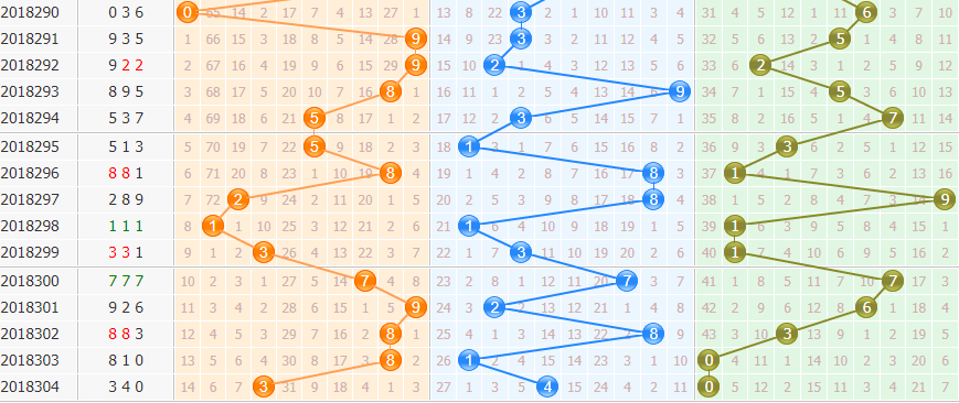 跨度分析:上期跨度4,属于小跨度开出,分析近期各区出号走势,本期跨度值看好大跨度值,重点关注5跨防4跨。