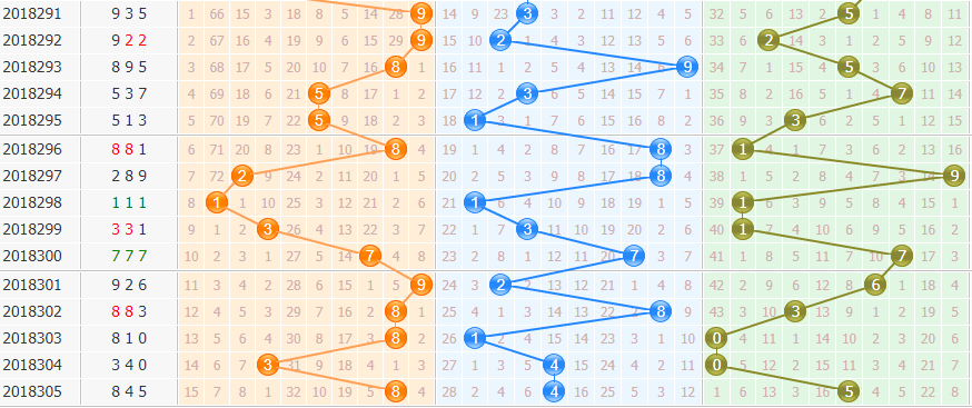 跨度分析:上期跨度4,属于小跨度开出,分析近期各区出号走势,本期跨度值看好大跨度值,重点关注5跨防8跨。