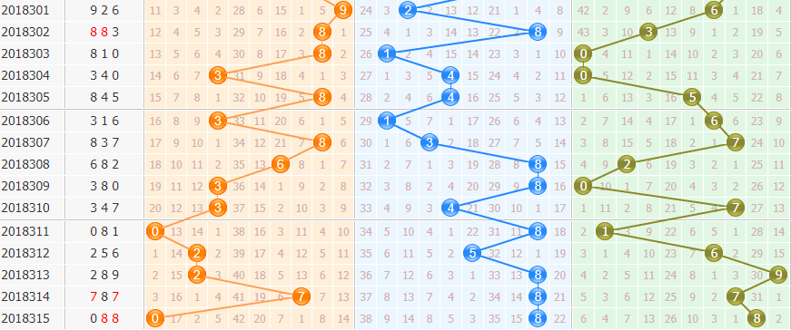 跨度分析:上期跨度8,属于大跨度开出,分析近期各区出号走势,本期跨度值看好小跨度值,重点关注3跨防6跨。