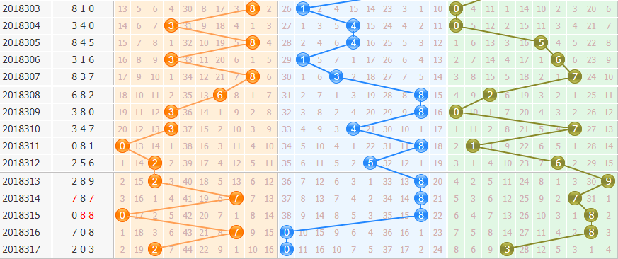 跨度分析:上期跨度3,属于小跨度开出,分析近期各区出号走势,本期跨度值看好小跨度值,重点关注4跨防8跨。